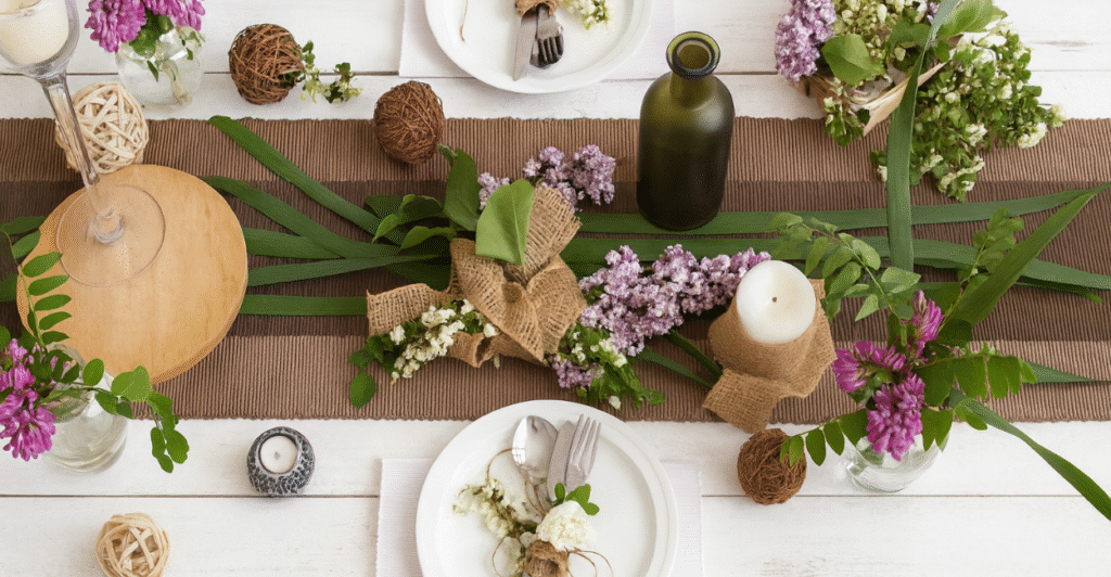 Os guardanapos podem ser de tecido, com um anel rústico, ou até enrolados com barbante e um galhinho de alecrim. Os talheres, mesmo os mais simples, ganham outro ar quando dispostos com cuidado. É aí que mora o encanto.