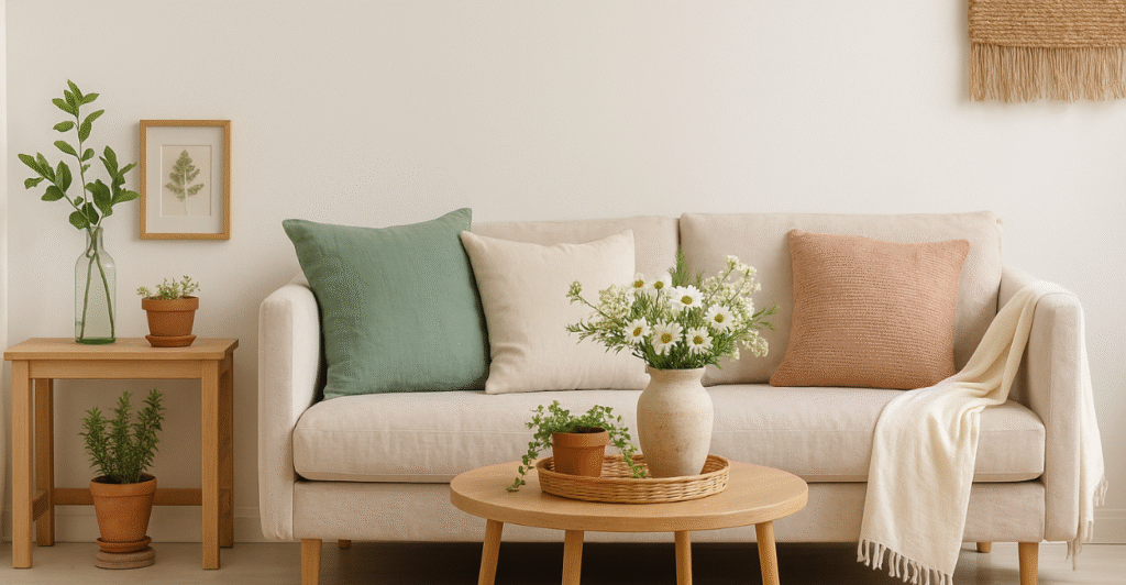 Primavera combina com flores – isso é fato. Mas no estilo de decoração consciente para a primavera, a ideia não é encher a casa de arranjos comprados, e sim trazer o verde de forma mais integrada e respeitosa.