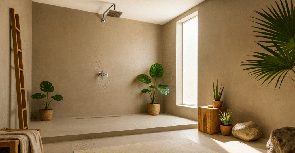 Outra tendência que vem bombando — e que reforça o fim do box de vidro em 2026 — são os banheiros sem divisão física nenhuma. Isso mesmo: nada de cortina, nem painel, nem vidro. Só o espaço livre.